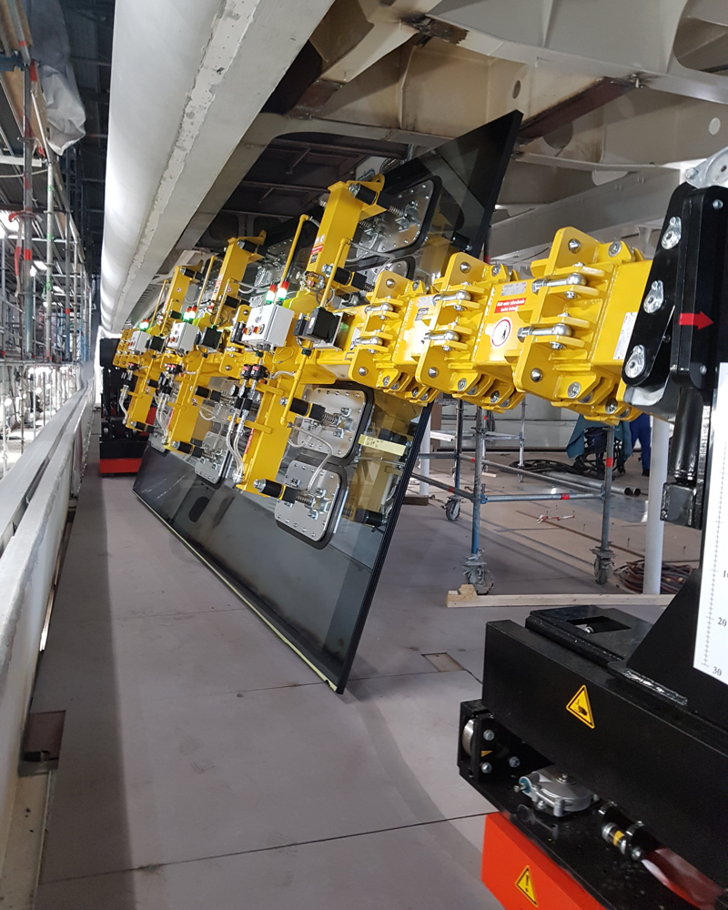 Transporting and placing the glass elements requires precise and exact control. Here, 2 Glasboy 5300s were controlled by specialists via radio with mm-level precision.